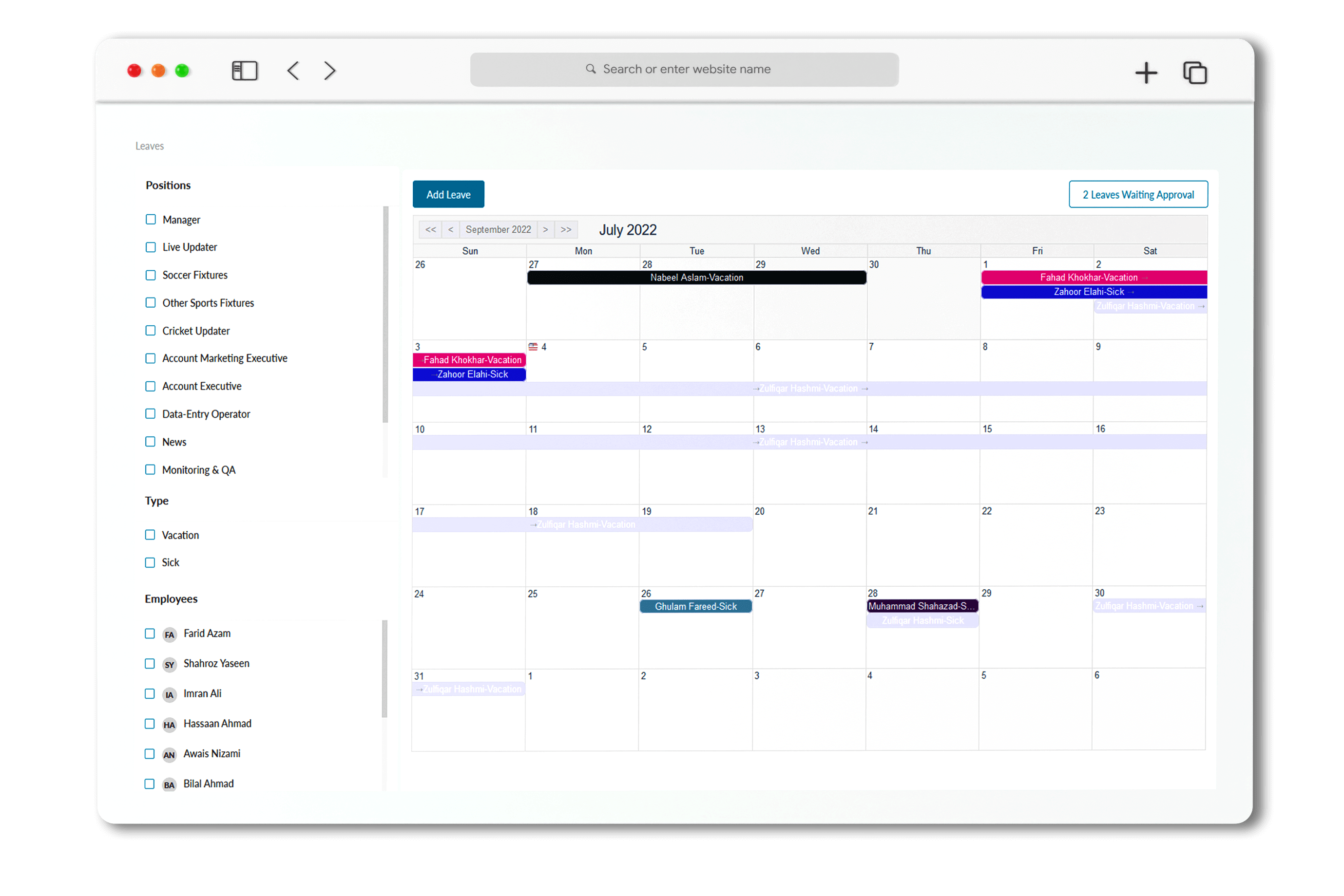 CleverStaff helps you track employee leaves. With a comprehensive Leave calendar, you can always check who is missing. CleverStaff uses the information when scheduling, so you can easily see who's available.